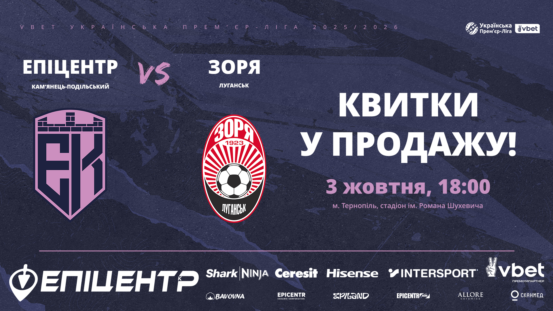 У п’ятницю, 3 жовтня, в Тернополі на стадіоні «Ім. Романа Шухевича» о 18:00 відбудеться матч 8 туру VBET Української Прем’єр-Ліги. «Епіцентр» з Кам’янця-Подільського зіграє з луганською «Зорею».